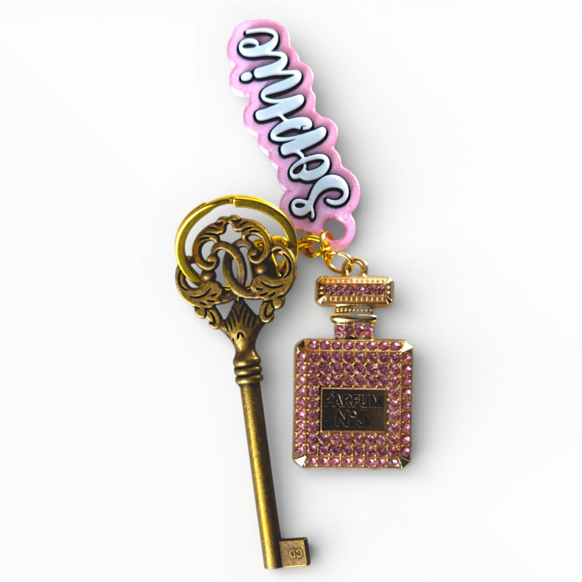 The Parfum No.5 Bottle design pairs your custom name with an iconic perfume bottle charm, creating a statement accessory that feels timeless and confident.
